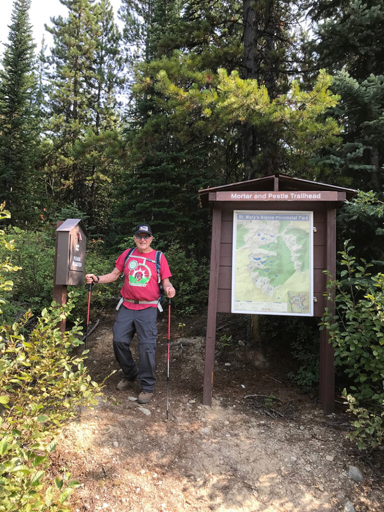 In the summer of 2018, Chamberlain and a group of friends set out to complete the final hike in the book, number 100: Mortar-Pestle Lakes. The hike is located in British Columbia’s St. Mary’s Provincial Park, a remote wilderness area northwest of Cranbrook, BC. As Landers’ description in “100 Hikes” puts it, “This little niche of wilderness is so far off the beaten track, it doesn’t even have an official trail in its 22,650 acres.” Landers describes a steep, sparsely marked “trail” over granite boulders and alpine larch, noting that the area was previously home to a logging operation and “there’s a good chance you will have to seek out the trail to some degree.” He rates the hike “moderately difficult” in the book.