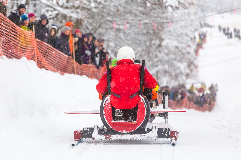 If you ask the locals, one of the highlights of the Carnival during the day is the Sonny Samuelson Bobsled Race. Teams of four design, build and ride their creative creations down eight icy blocks, on one of the steepest streets in town—Spokane Street. Reaching speeds of 44 miles per hour or more, this is hands down the wildest, most creative event of the Carnival. But the fun doesn’t end there–just two streets over on Queen Street, piles of snow are transformed into The Game Rail Jam, a custom-built downtown terrain park. Skiers, snowboarders and snowskaters glide, jib and slide across rails, boxes and jumps, showing off tricks that are equal parts skill and showmanship. The rail jam is open to anyone who is brave enough to tackle the streets and be part of the spotlight—where else would you have the chance to slide down a city street?