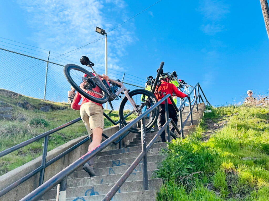 2026 will be the fourth edition of the Stair Master. You’ll show up at the Riverfront Fountain ready to roll (because I can tell by the way you’re reading this that you’re definitely going) on Saturday, April 4, at 4:30 p.m. If you’re feeling extra gluttonous for punishment, you can start at 4 p.m. at the bottom of the Huntington Park stairs on the south side of the lower falls, where the gondola turns around. Follow these stairs all the way up to the patio on Post Street next to Mobius Discovery Center for a 200-step bonus. The falls will be raging; it’s totally worth it! Leave yourself enough time to mingle with other riders before the start and pair up with someone who has the route loaded on a GPS device, because this thing is tricky. I led my group astray last year while running GPS navigation, and I had ridden it the two previous years. Tricky, I tell ya.