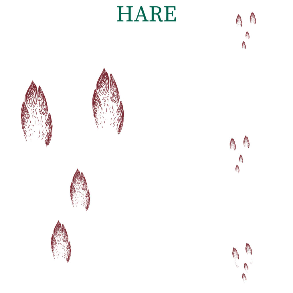 Snowshoe hares print in a distinctive pattern: two large hind feet land ahead of the smaller front ones as they hop. Their tracks often appear in clusters, each group marking a single bound. Look for them near thickets, brush piles or the edges of open fields where they feed at dusk and dawn.